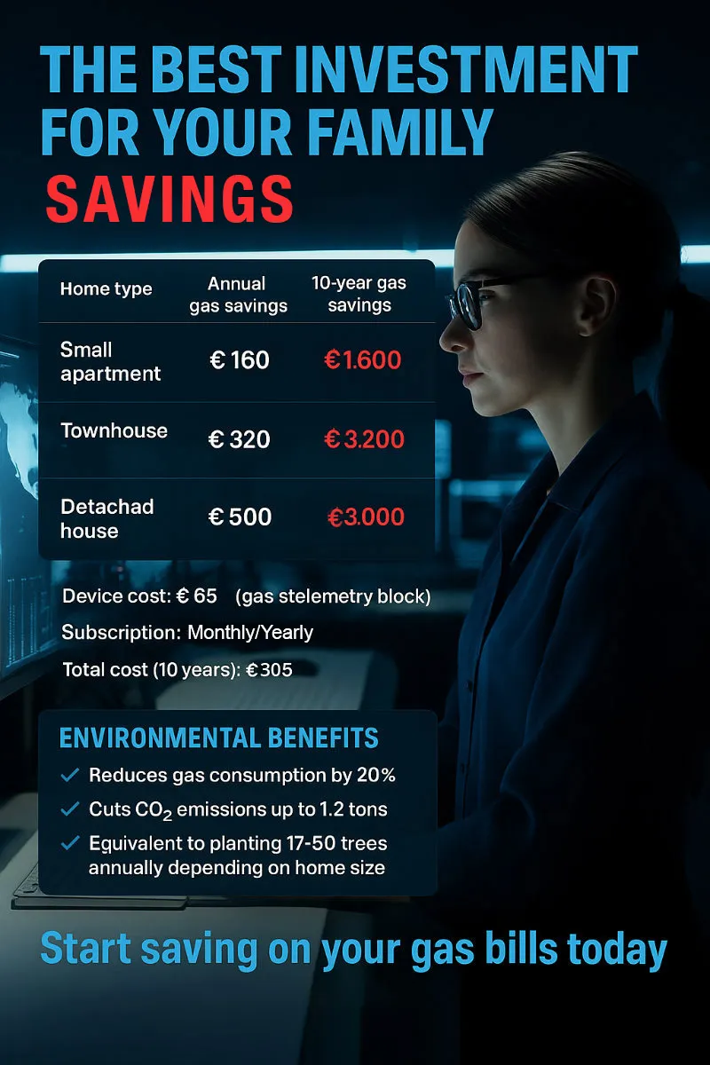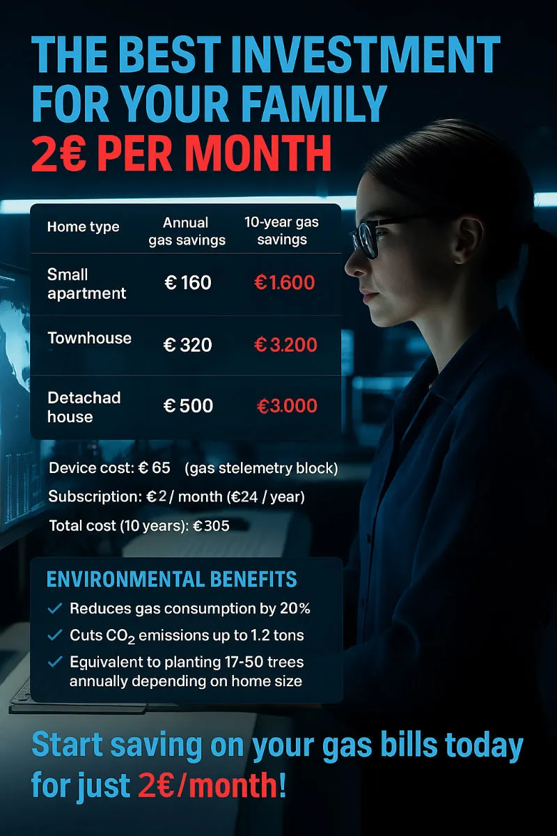 Take control of your energy future with a single telemetry block – the EU-certified solution that transforms passive consumption into active savings. By monitoring gas flow 24/7, this intelligent device identifies waste invisible to the naked eye, turning your meter into a profit center that pays you back month after month. Discover how thousands of European households are slashing bills while supporting the Green Transition.